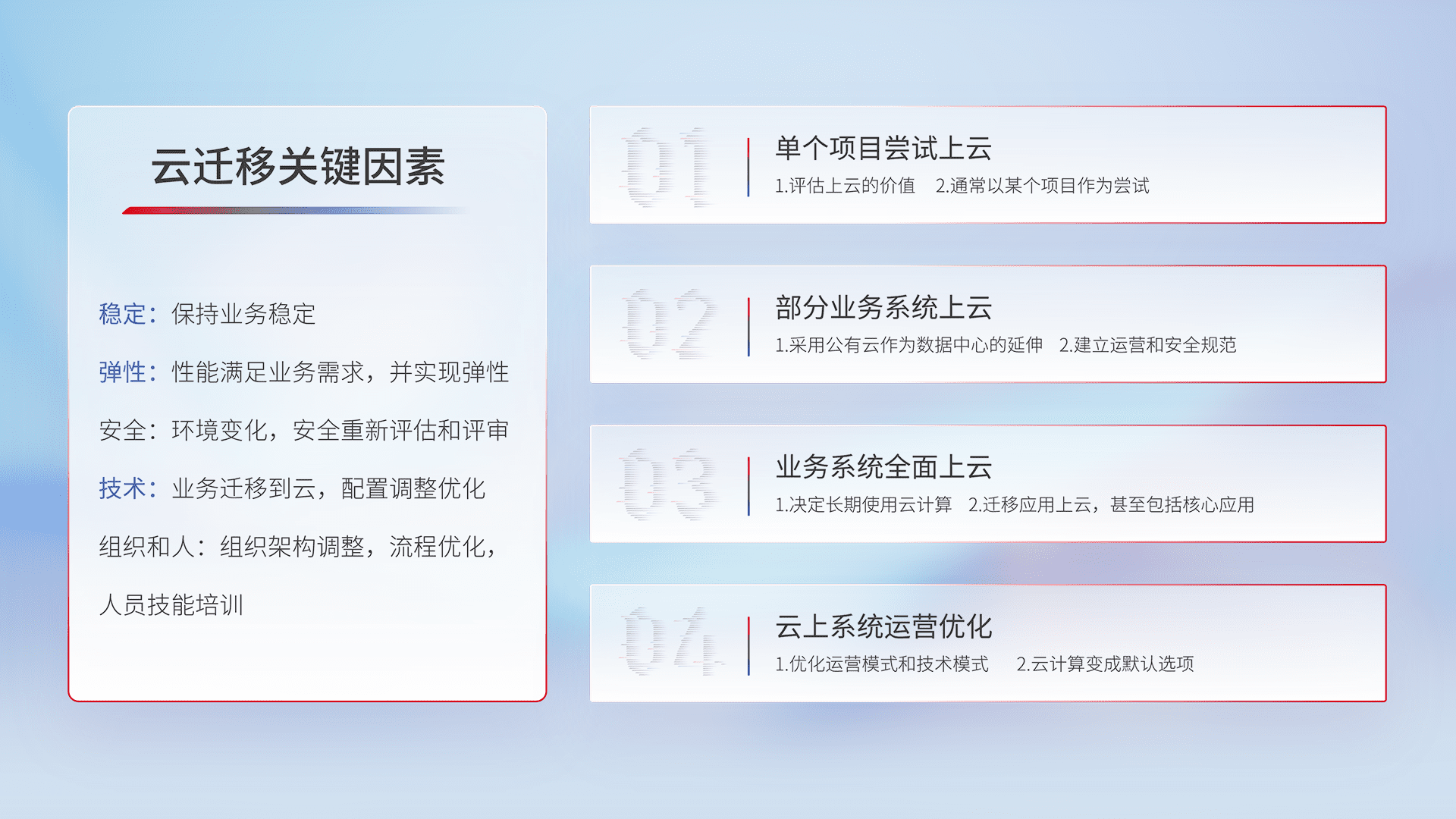 结合实际业务,,,从规划设计、、云平台选型、、、云原生改造、、、、数据迁移、、、、集成交付,,,迁移全过程为客户识别最佳上云路径,,,,做好风险识别管理,,,设计网络架构、、、、身份权限、、安全审计合规、、操作审计、、、、日志审计、、、监控告警策略、、、、多站点容灾设计等,,,,对云上基础设施进行整体规划,,提升IT治理水平,,,以满足弹性、、、、高可用、、、高性能的需求。。。