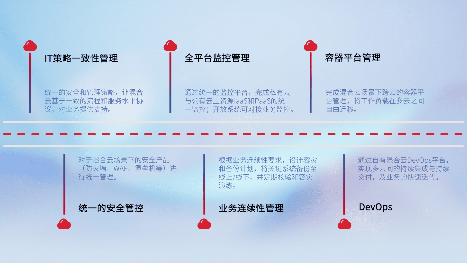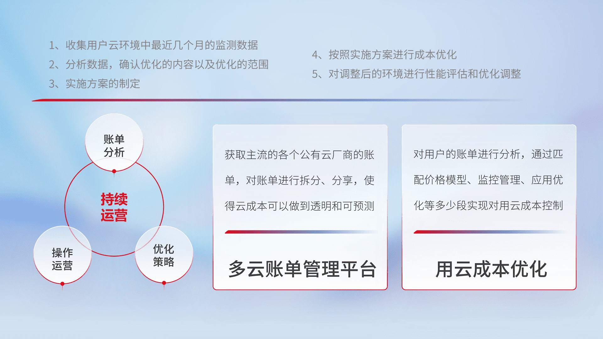 通过多云纳管,,,,以统一的资源数据模型把客户的云资源进行抽象和封装,,,进而实现对多云资源的统一操作,,,保障云资源管理的可靠性、、、稳定性与可用性。。量身定制化运维内容,,,配置、、、开发运维、、、补丁管理、、备份、、监控、、、、认证和访问管理、、、、审计和日常巡检等,,,保障在用云过程中的可靠度,,稳定度以及高可用率。。。