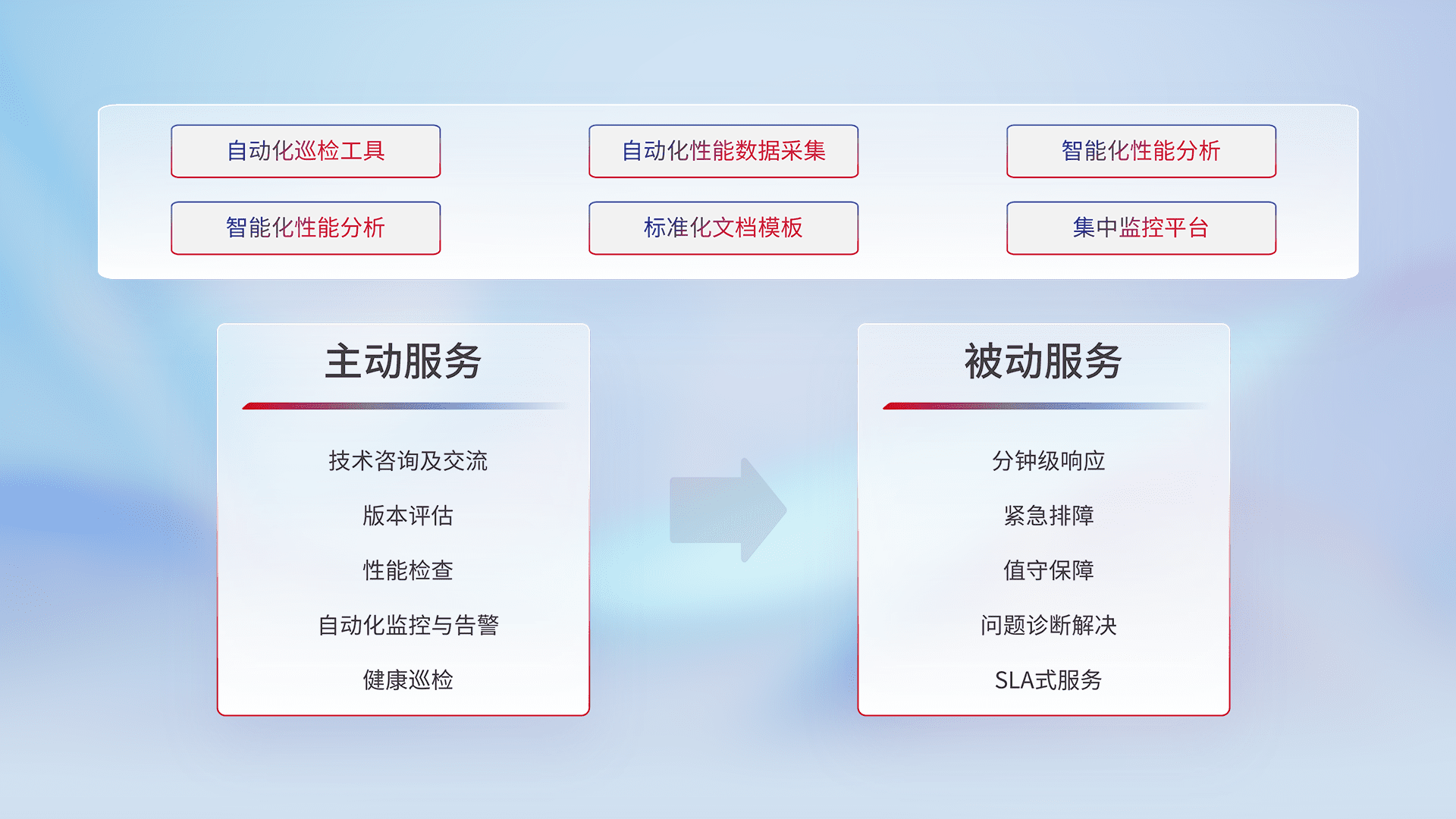 智能化工具和标准化文档,,,保障服务质量,,提供主动服务(包含技术咨询、、、、版本评估、、性能检查、、、、自动化监控与告警、、、、健康巡检)和被动服务包含(分钟级响应、、、、紧急排障、、值守保障、、、问题诊断解决、、SLA服务)。。